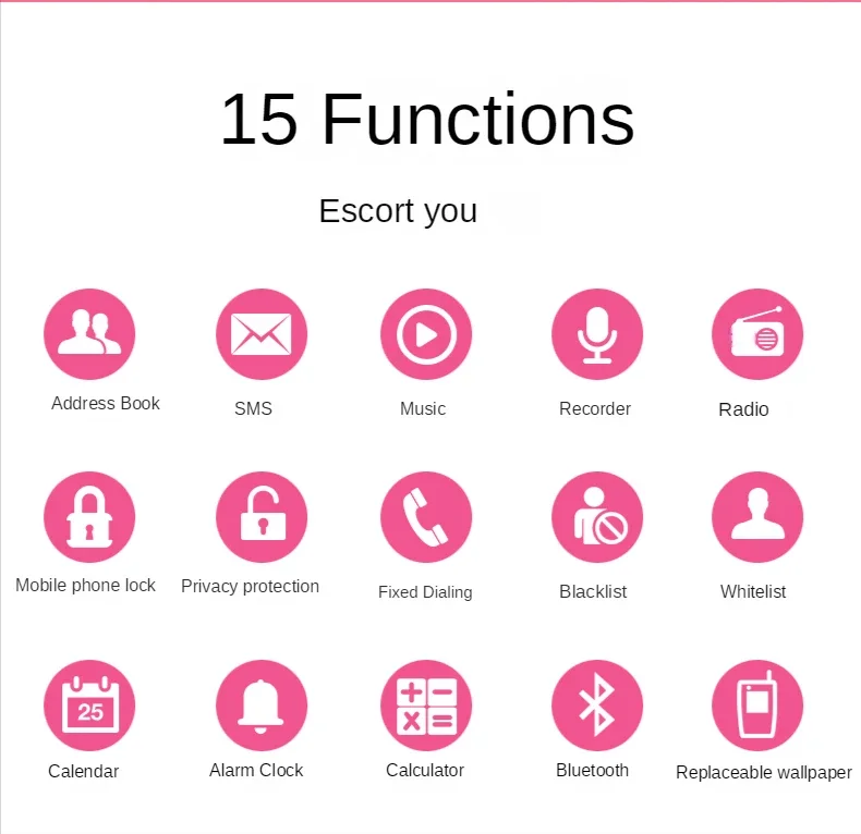 ●Functions: BT dailer,MP3 player,TF card slot,Merssage, Vibration,Calendar, Alarm, Calculator…etc.